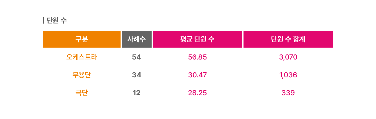 단원 현황은 꿈의 오케스트라, 무용단, 극단의 장르적인 차이점 때문에 차이가 눈에 보입니다. 세부적으로 보면, 오케스트라 단원 수가 56.85명으로, 꿈의 무용단(30.47명)과 극단(28.25명) 보다 훨씬 많습니다. 이는 여러 악기와 파트로 구성되는 오케스트라의 장르적 특성에 기인한 것으로 추측됩니다.