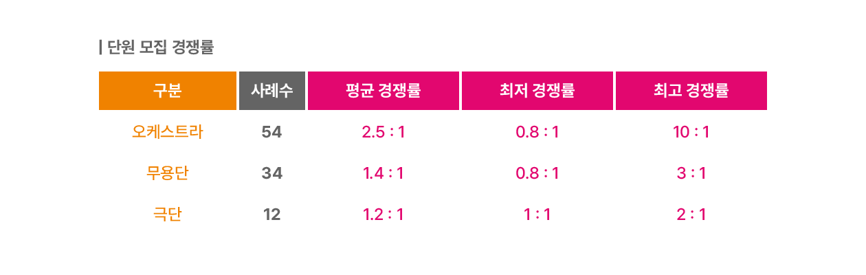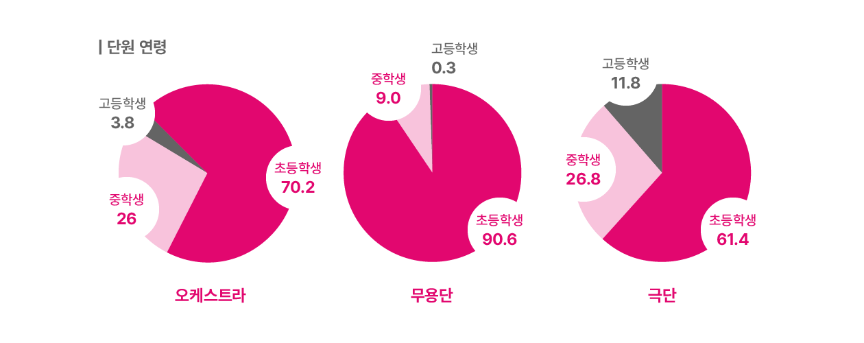 연령 구성도 조금씩 차이를 보이는데요, 꿈의 무용단은 초등학생이 90.6%로 압도적으로 많았고, 꿈의 극단은 중학생 26.8%, 고등학생이 11.8%로 세 장르 중 가장 청소년 층이 두꺼운 것으로 나타났습니다. 또한 단원 모집 경쟁률은 평균 1.7:1 정도 보이고 있습니다.