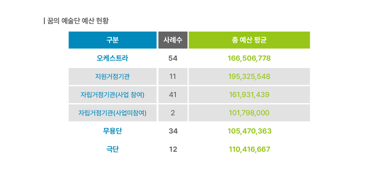 * 꿈의 예술단 현황조사는 지난 8월~9월, 꿈의 오케스트라 54개소, 무용단 34개소, 극단 12개소 행정담당자님들의 도움으로 진행되었습니다.🙏 |