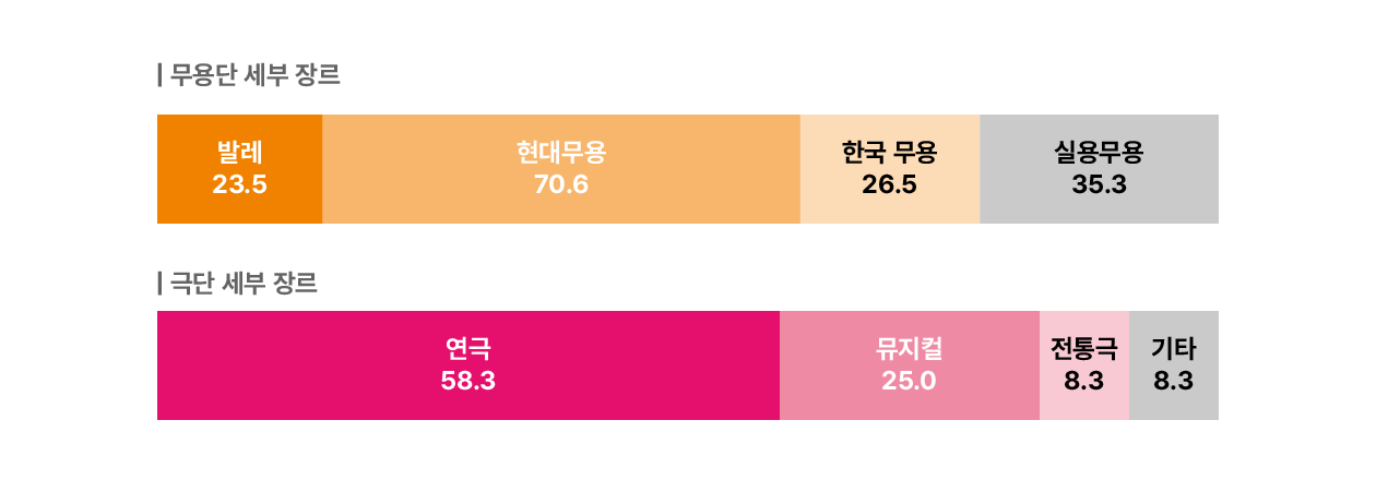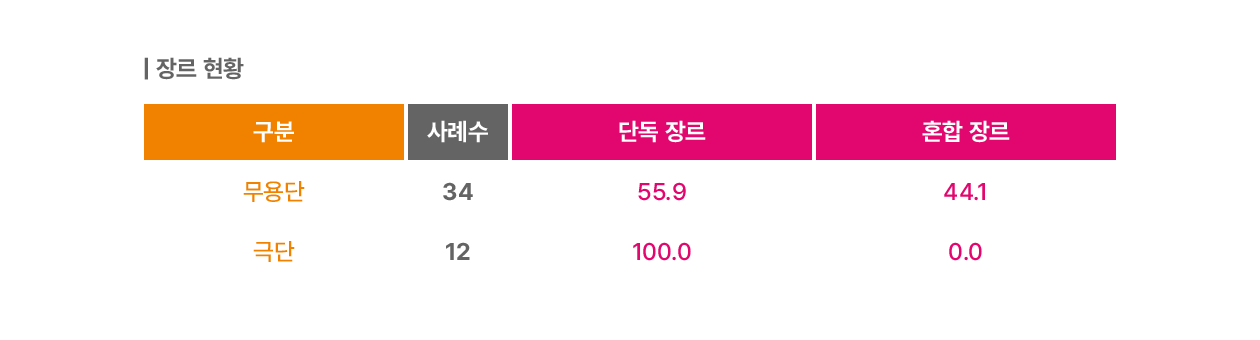 꿈의 극단은 모두 단독 장르를 운영하고 있으나, 꿈의 무용단은 약 44%가 혼합 장르로 운영하고 있었습니다. 극단은 연극>뮤지컬>마당극·인형극으로 운영하며, 무용단은 현대무용>실용무용>한국무용>발레 순으로 운영하고 있습니다. |
